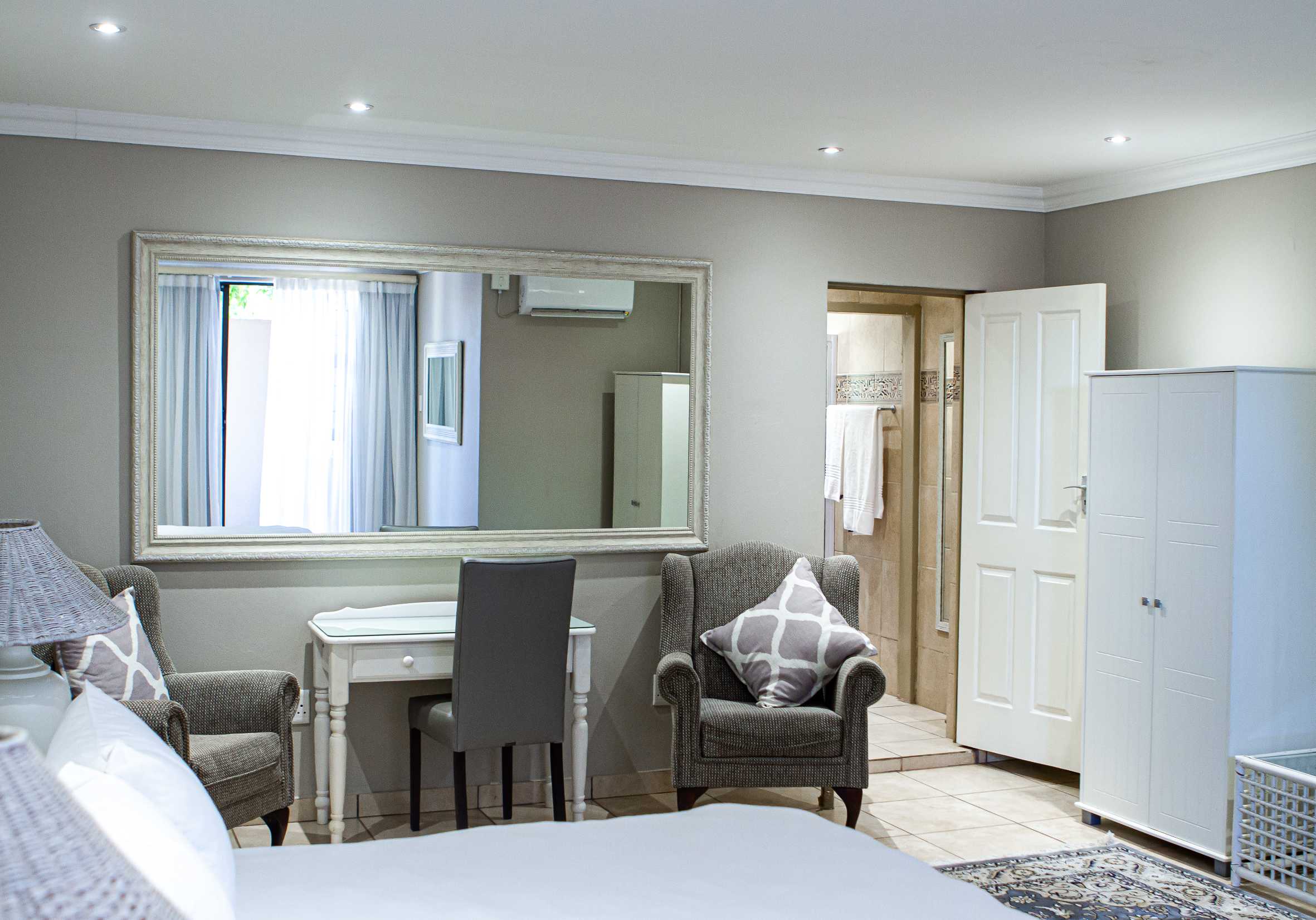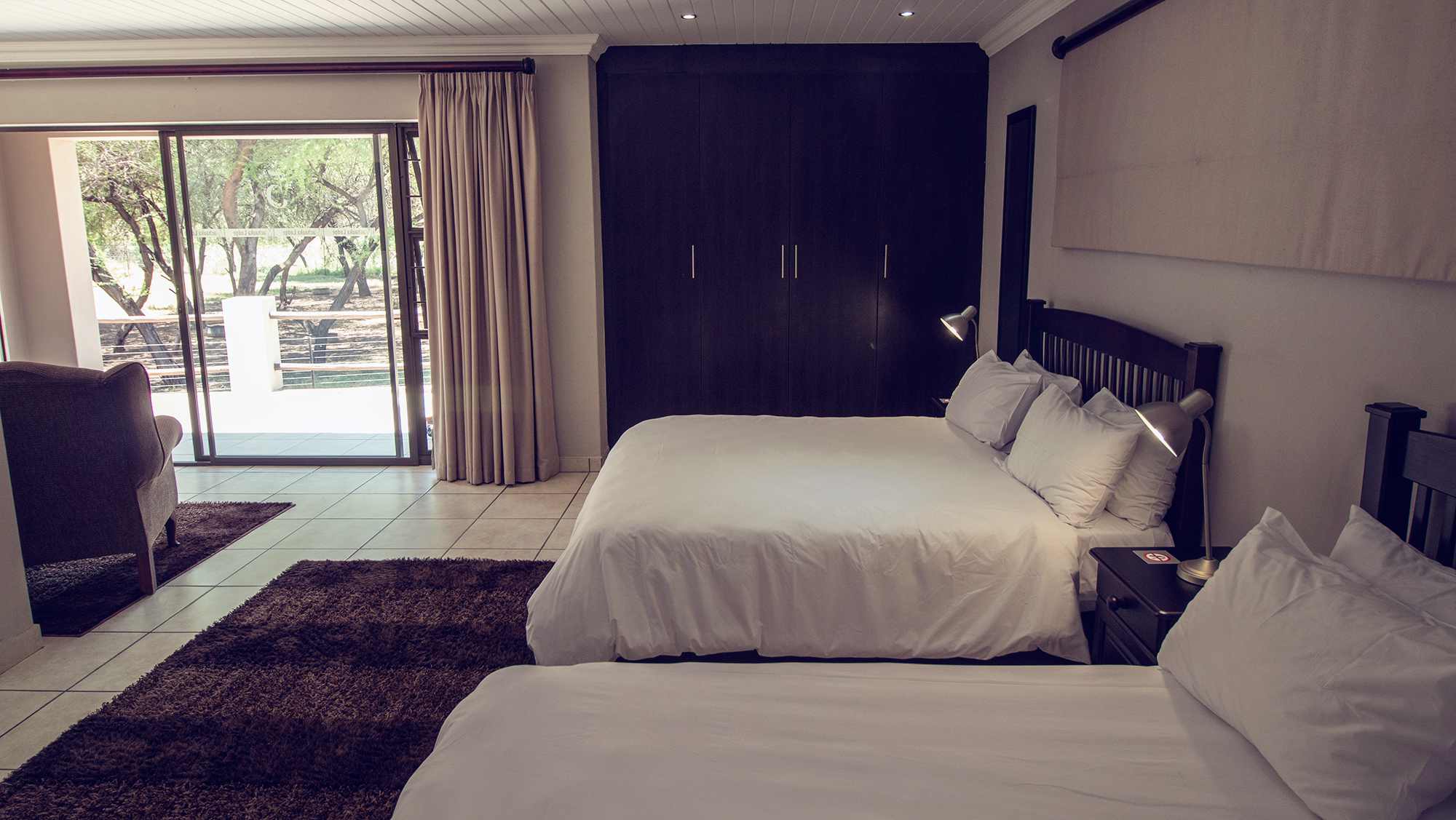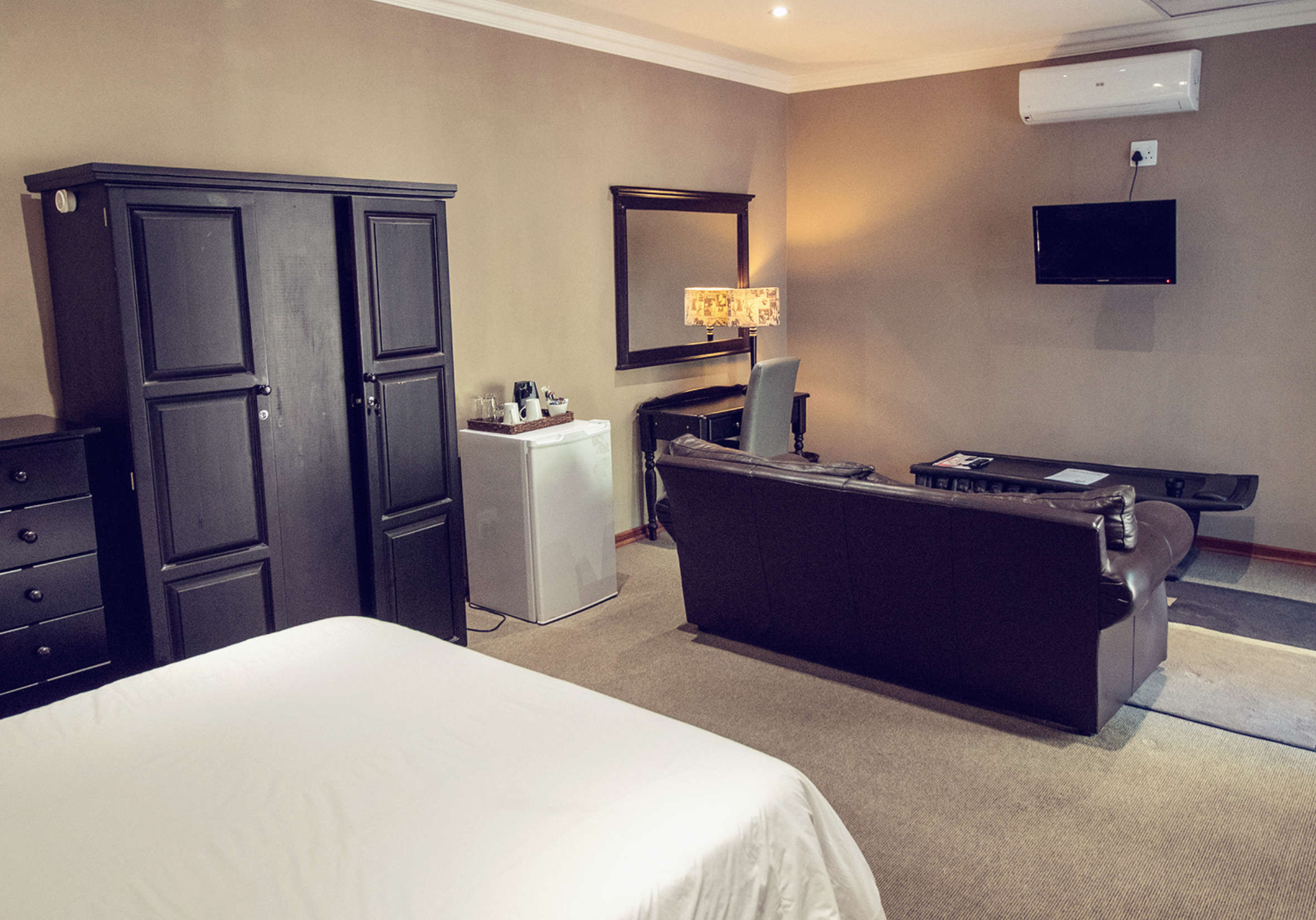 The lodge consists of 9 beautiful decorated studio rooms. Our rooms have modern and simplistic décor furnishings and are air-conditioned with free Wi-Fi throughout the property. All rooms consist of a flat-screen TV with 13 available DStv channels. Guests also enjoyed the coffee and tea station facility, as well as the bar fridge where they are welcome to stock with refreshments of their preferences.